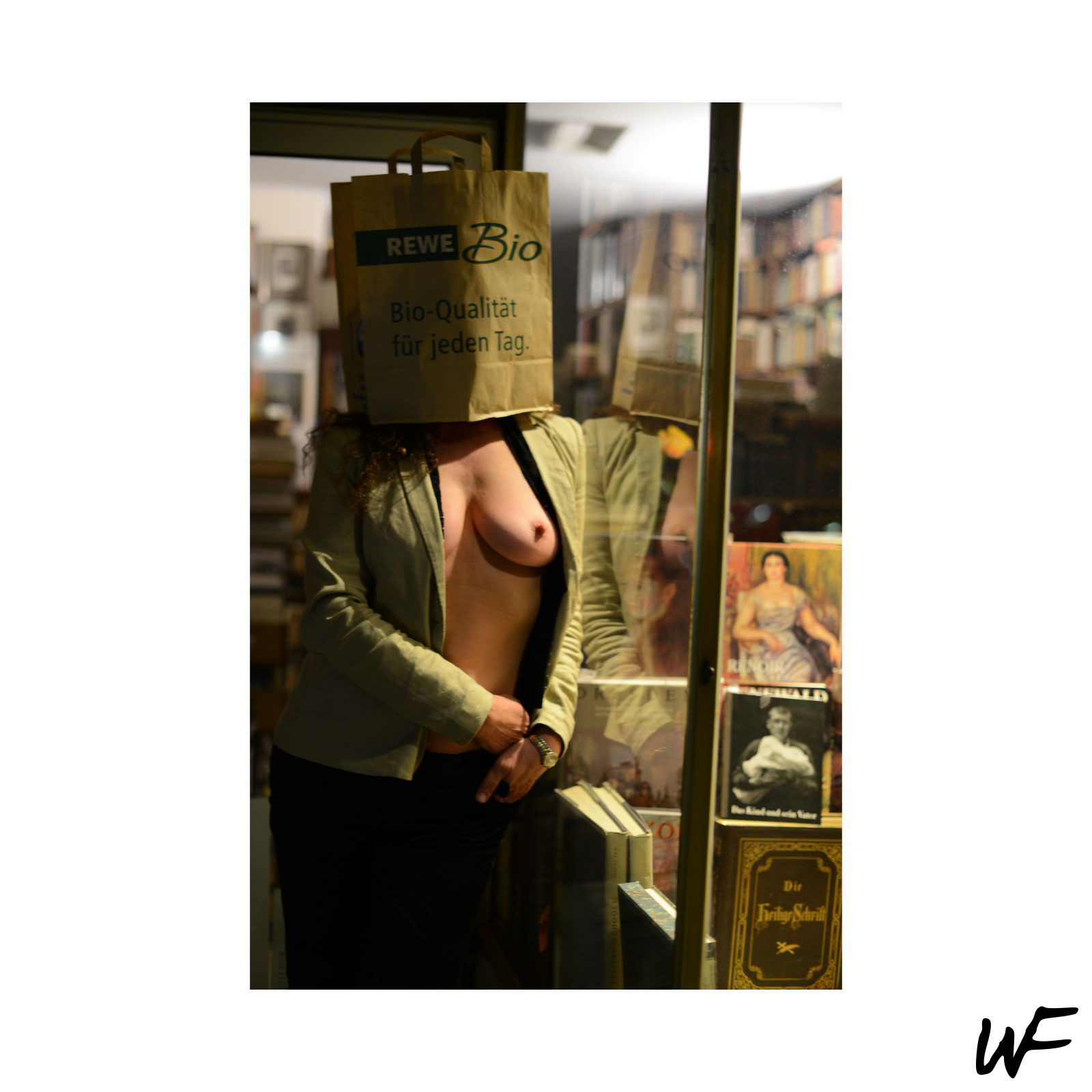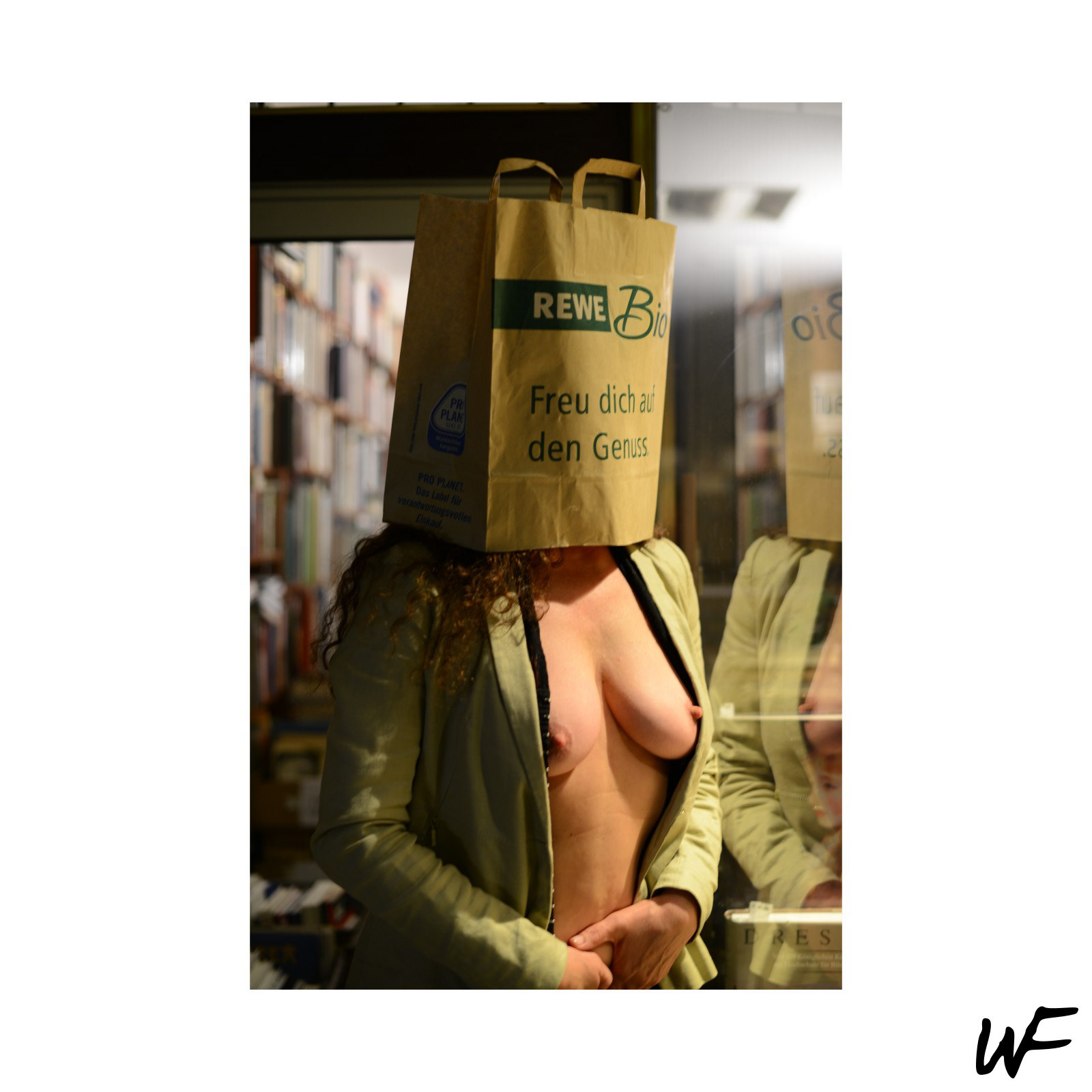 „Freu dich auf den Genuss / Look lorward to the Pleasure” was created in Berlin in 2014. It is a series of photographs that balances between intimacy and anonymity, where the bag removes subjecthood, turning the protagonist into a “product.” The theme is corporeality and identity inscribed in the language of consumption.