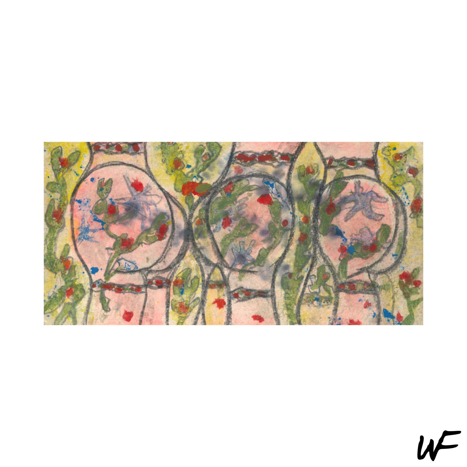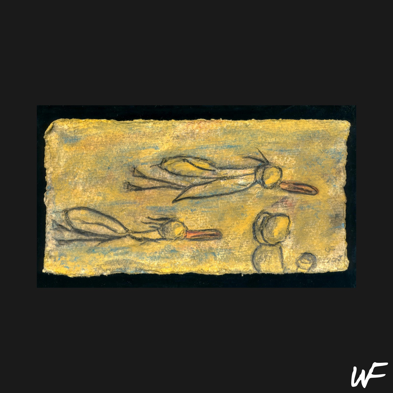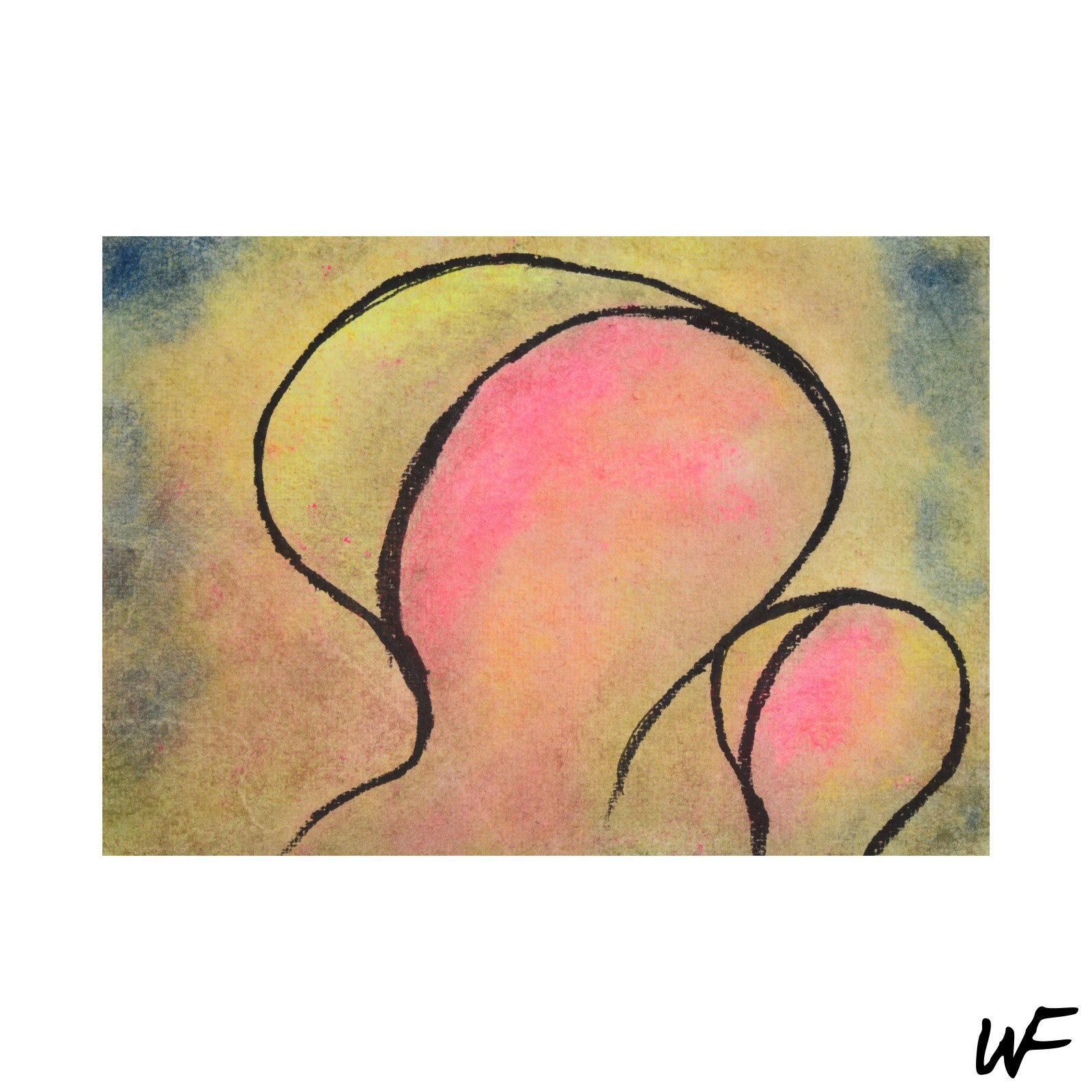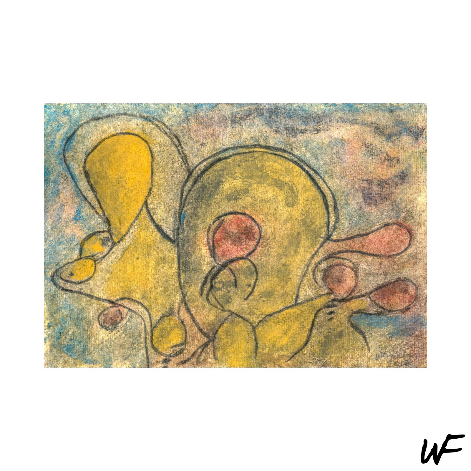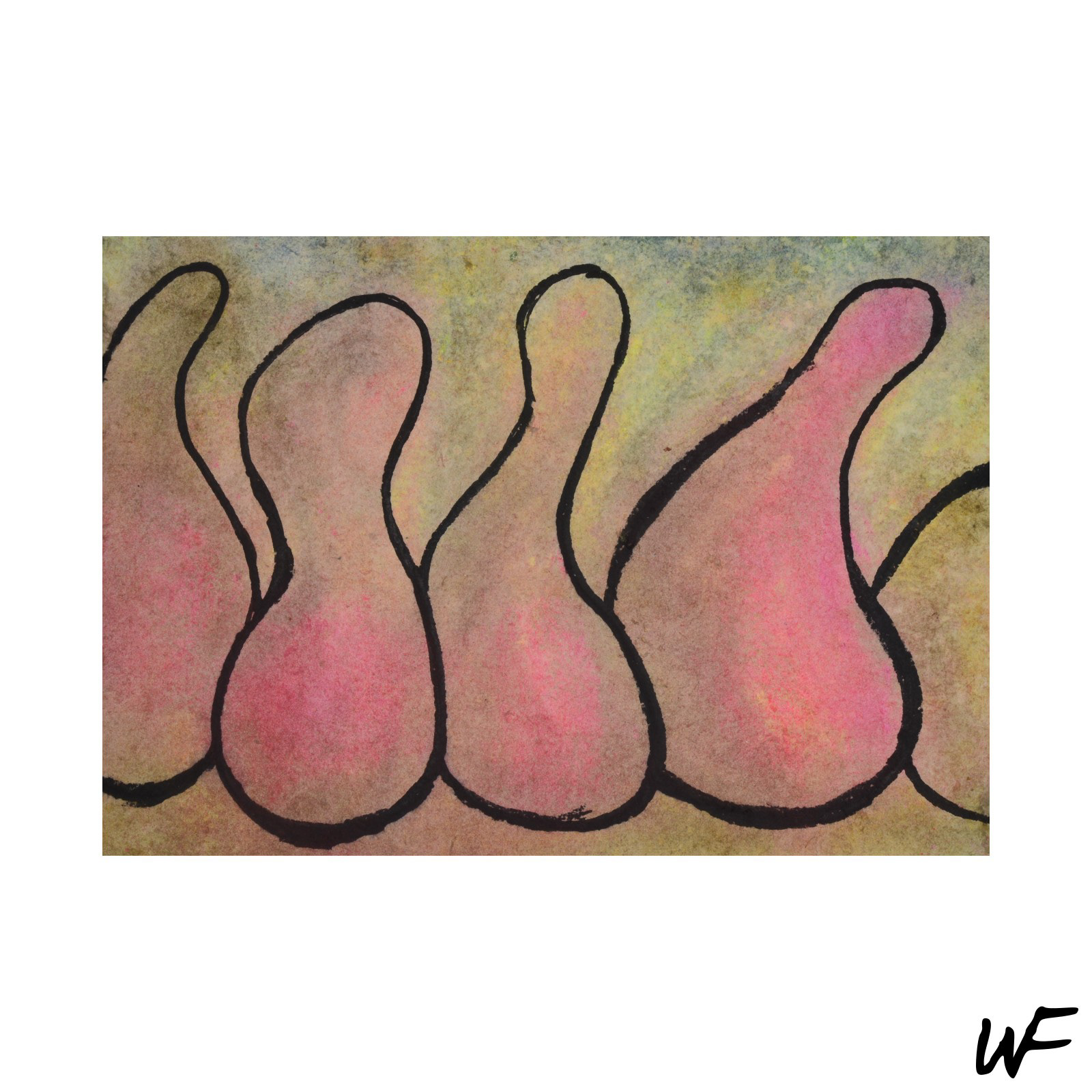 PL / Cykl subtelnych i intrygujących kompozycji, które balansują na granicy znaku, formy i gestu. Artysta posługuje się delikatną paletą pastelowych barw, przełamywaną wyrazistym konturem i organiczną plamą. Figury na obrazach zdają się być zawieszone pomiędzy abstrakcją a narracją – przywodzą na myśl symbole pierwotnych rytuałów lub fragmenty języka wizualnego, który dopiero się tworzy.