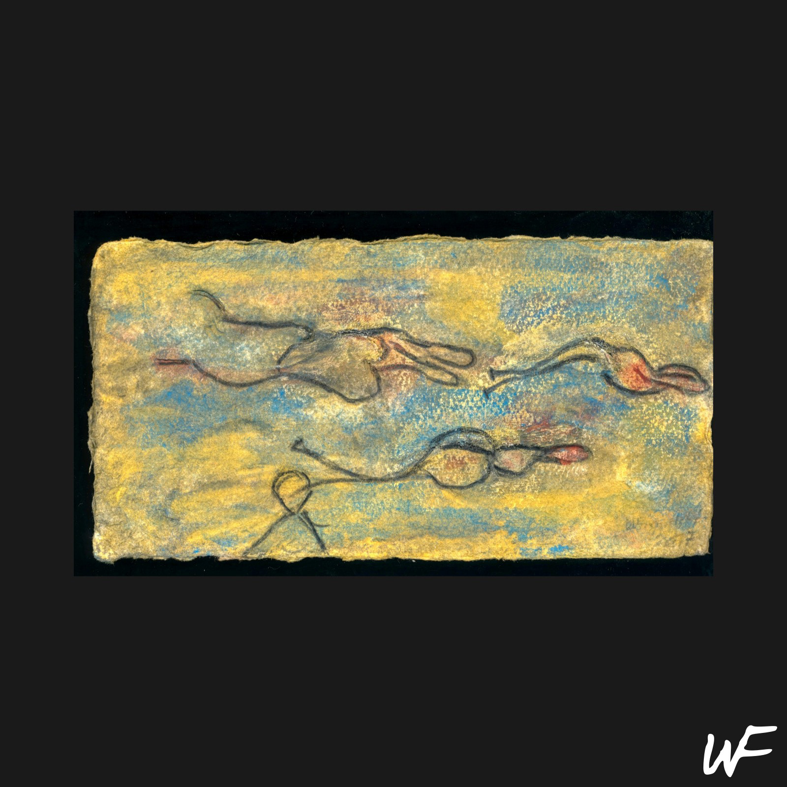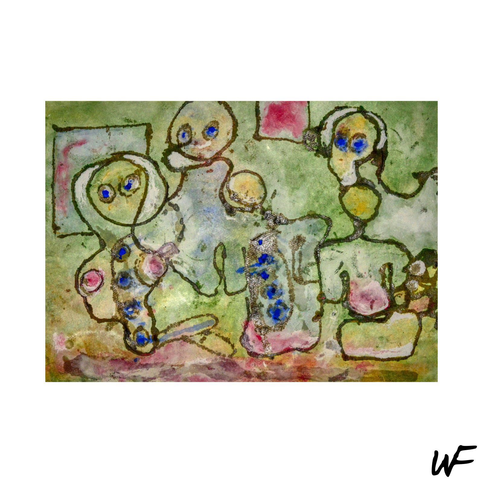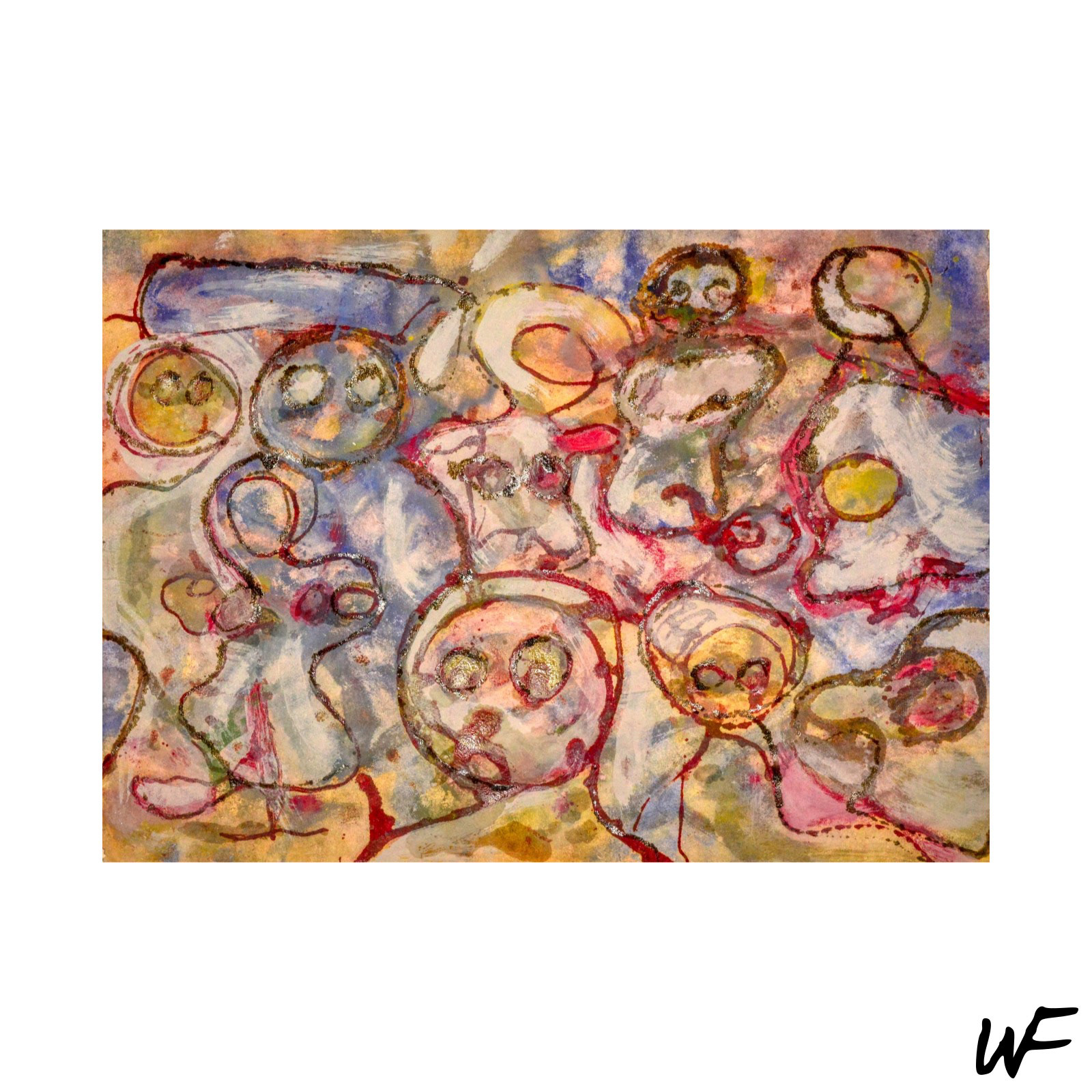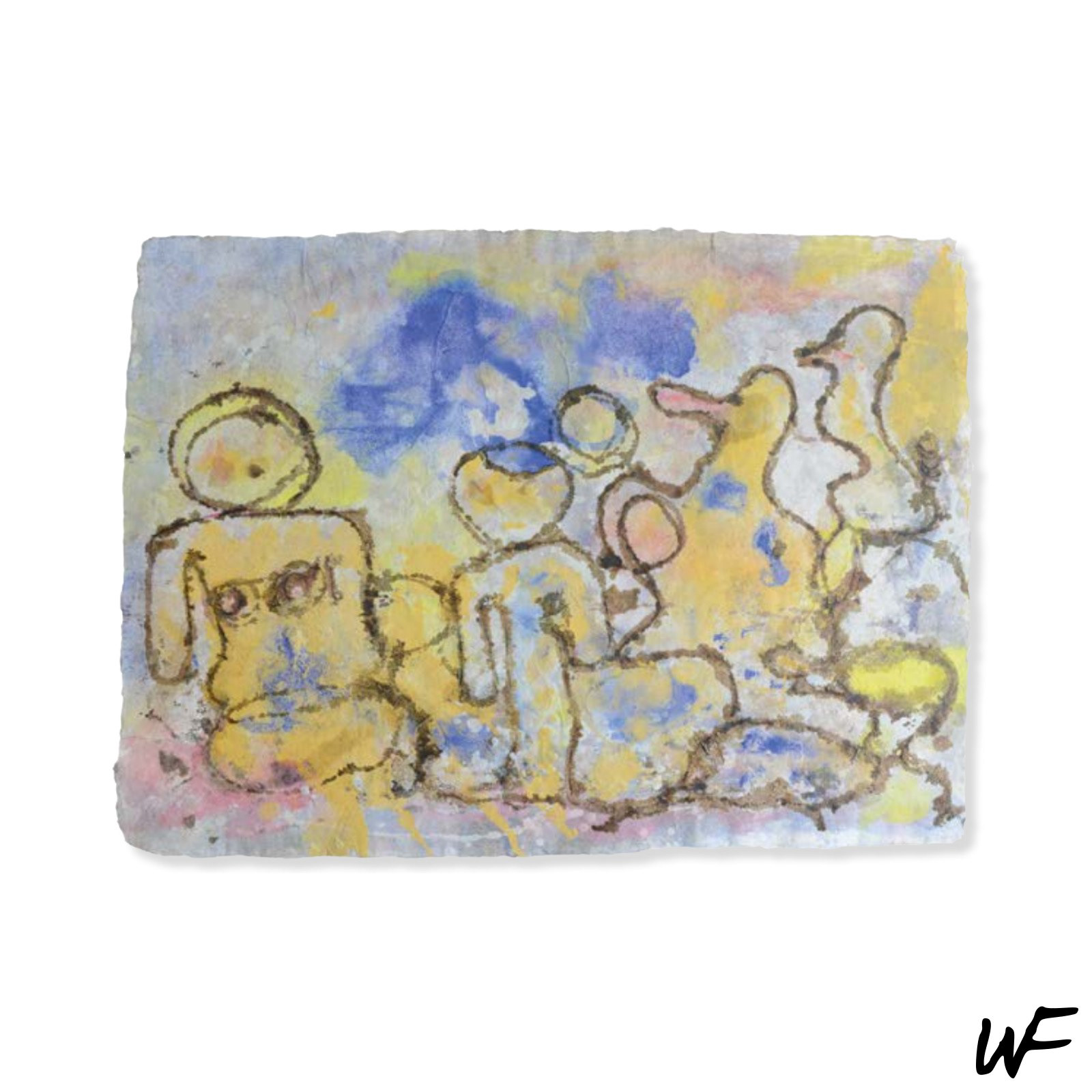 DE / Ein Zyklus subtiler und vielschichtiger Kompositionen, die zwischen Zeichen, Form und Geste balancieren. Der Künstler arbeitet mit einer zarten Pastellpalette, die durch markante Konturen und organische Farbflecken durchbrochen wird. Die Figuren auf den Bildern scheinen zwischen Abstraktion und Erzählung zu schweben – sie erinnern an Symbole urzeitlicher Rituale oder an Fragmente einer visuellen Sprache, die erst im Entstehen begriffen ist.