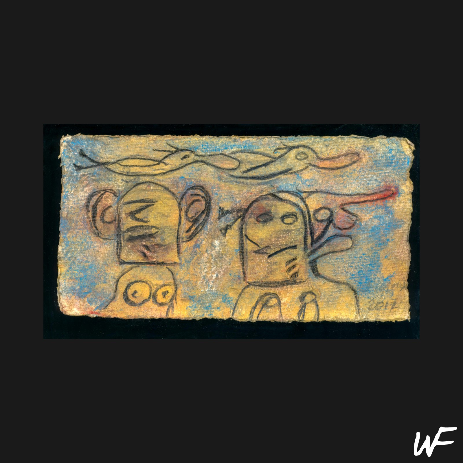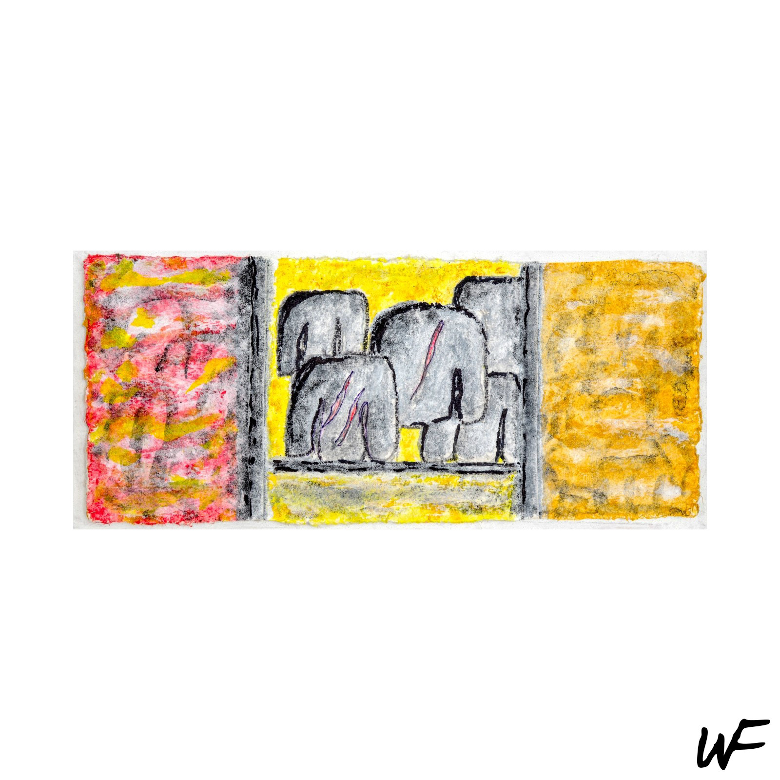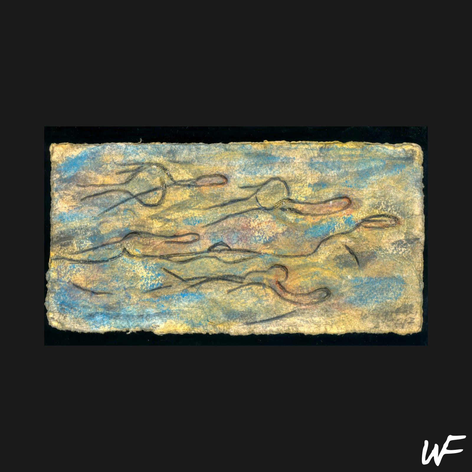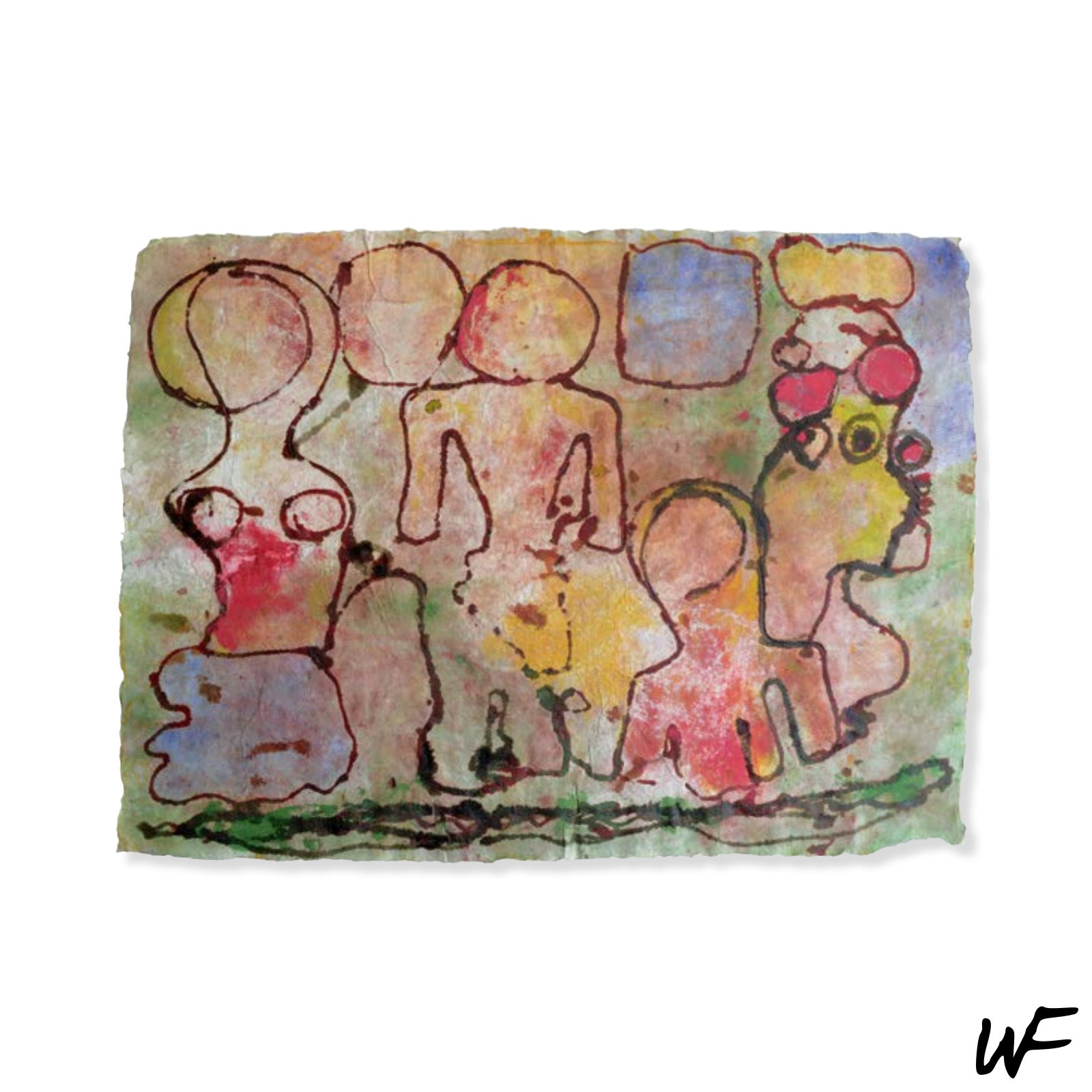 DE / Ein Zyklus subtiler und vielschichtiger Kompositionen, die zwischen Zeichen, Form und Geste balancieren. Der Künstler arbeitet mit einer zarten Pastellpalette, die durch markante Konturen und organische Farbflecken durchbrochen wird. Die Figuren auf den Bildern scheinen zwischen Abstraktion und Erzählung zu schweben – sie erinnern an Symbole urzeitlicher Rituale oder an Fragmente einer visuellen Sprache, die erst im Entstehen begriffen ist.