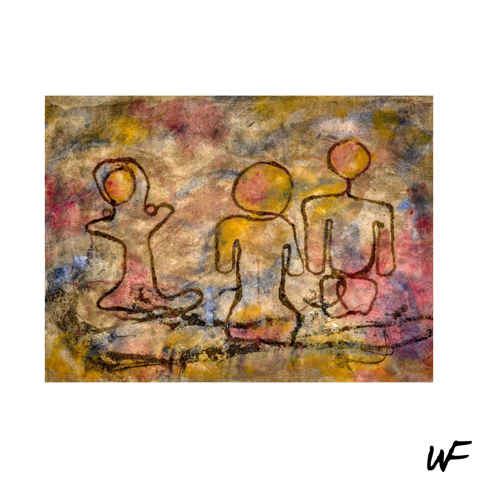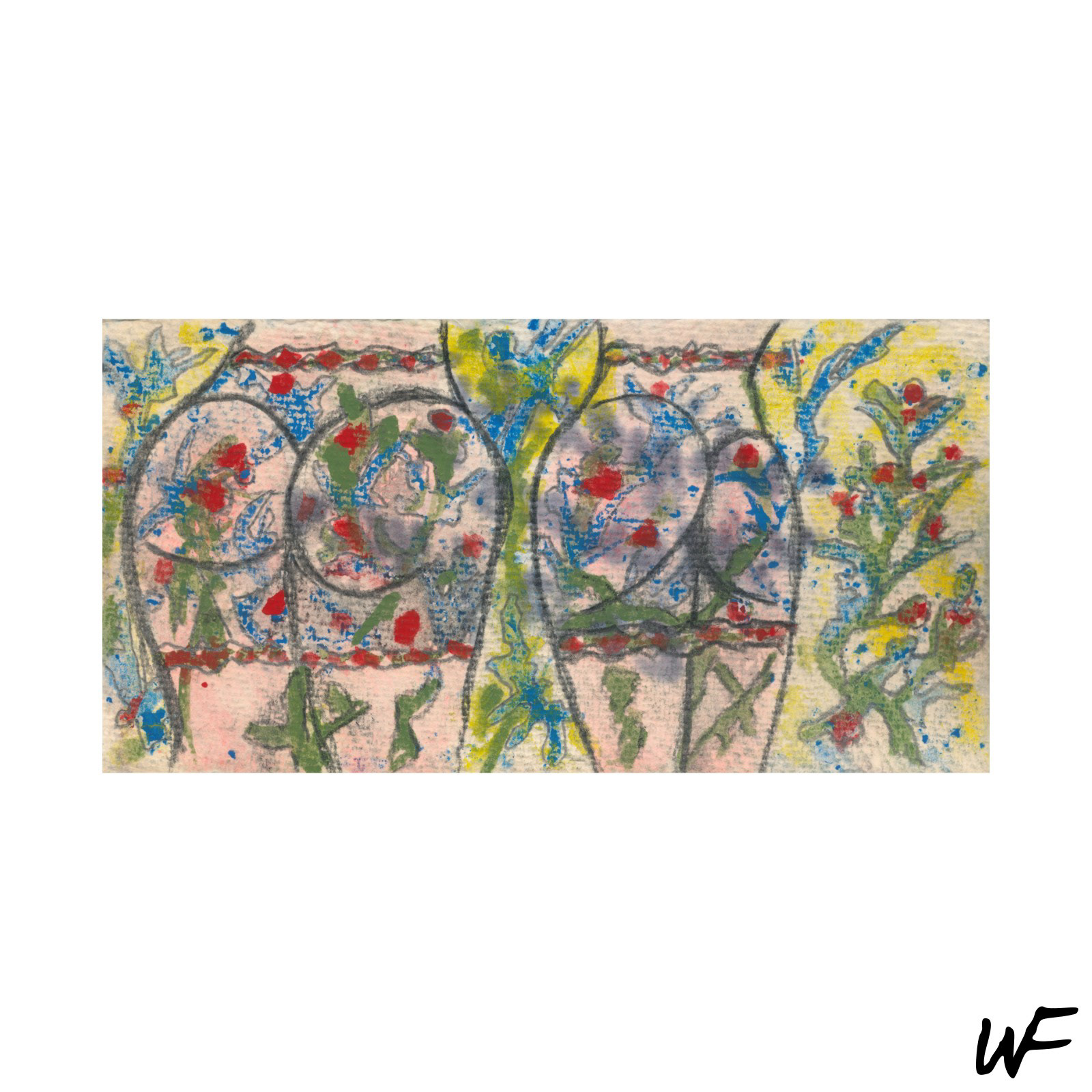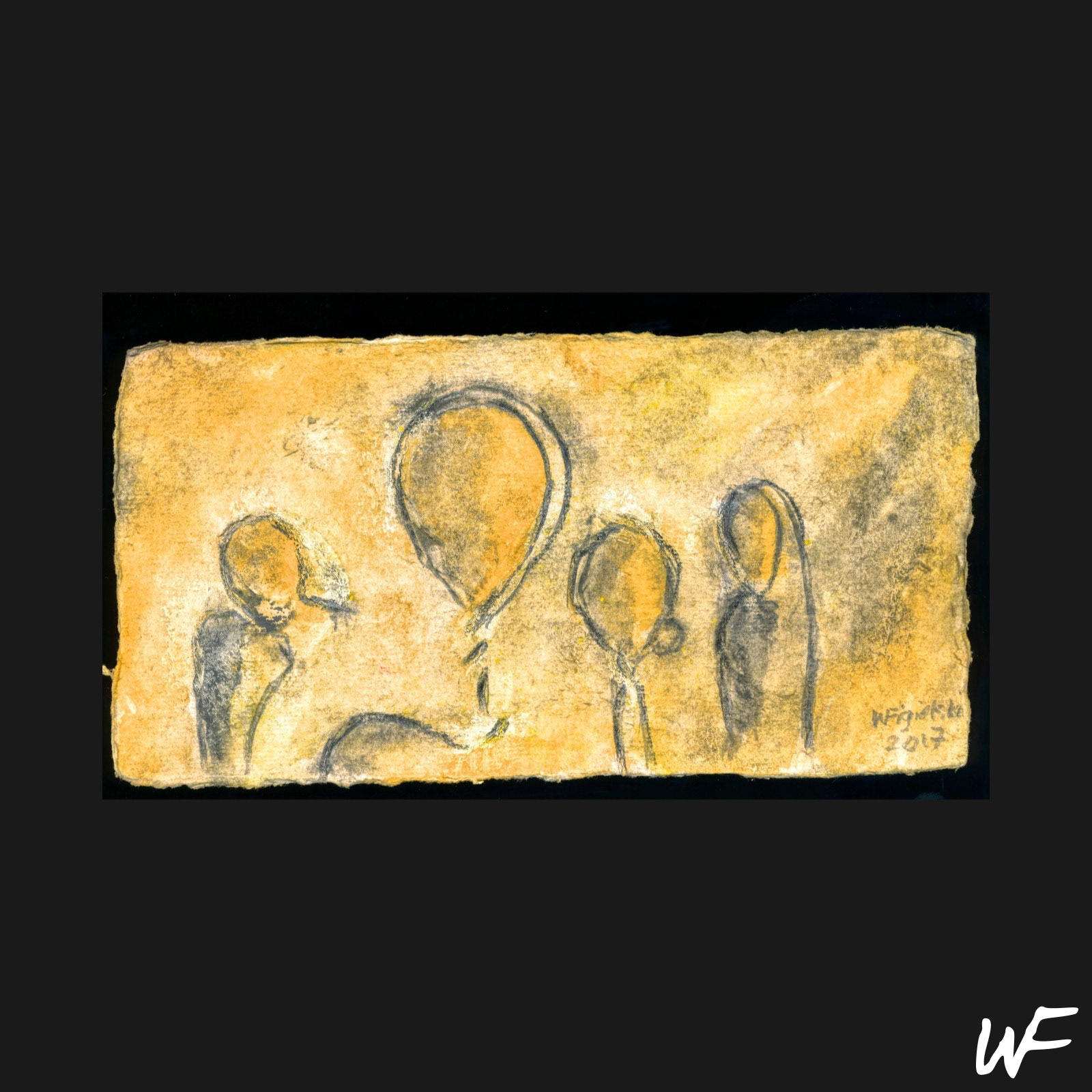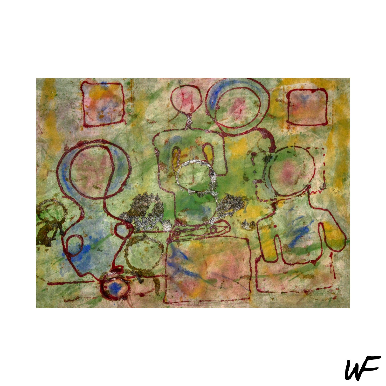 DE / Ein Zyklus subtiler und vielschichtiger Kompositionen, die zwischen Zeichen, Form und Geste balancieren. Der Künstler arbeitet mit einer zarten Pastellpalette, die durch markante Konturen und organische Farbflecken durchbrochen wird. Die Figuren auf den Bildern scheinen zwischen Abstraktion und Erzählung zu schweben – sie erinnern an Symbole urzeitlicher Rituale oder an Fragmente einer visuellen Sprache, die erst im Entstehen begriffen ist.