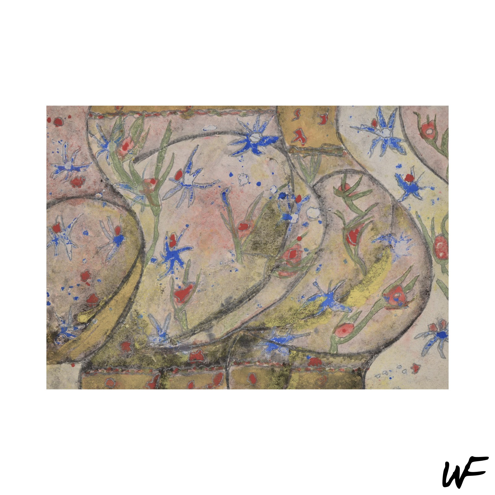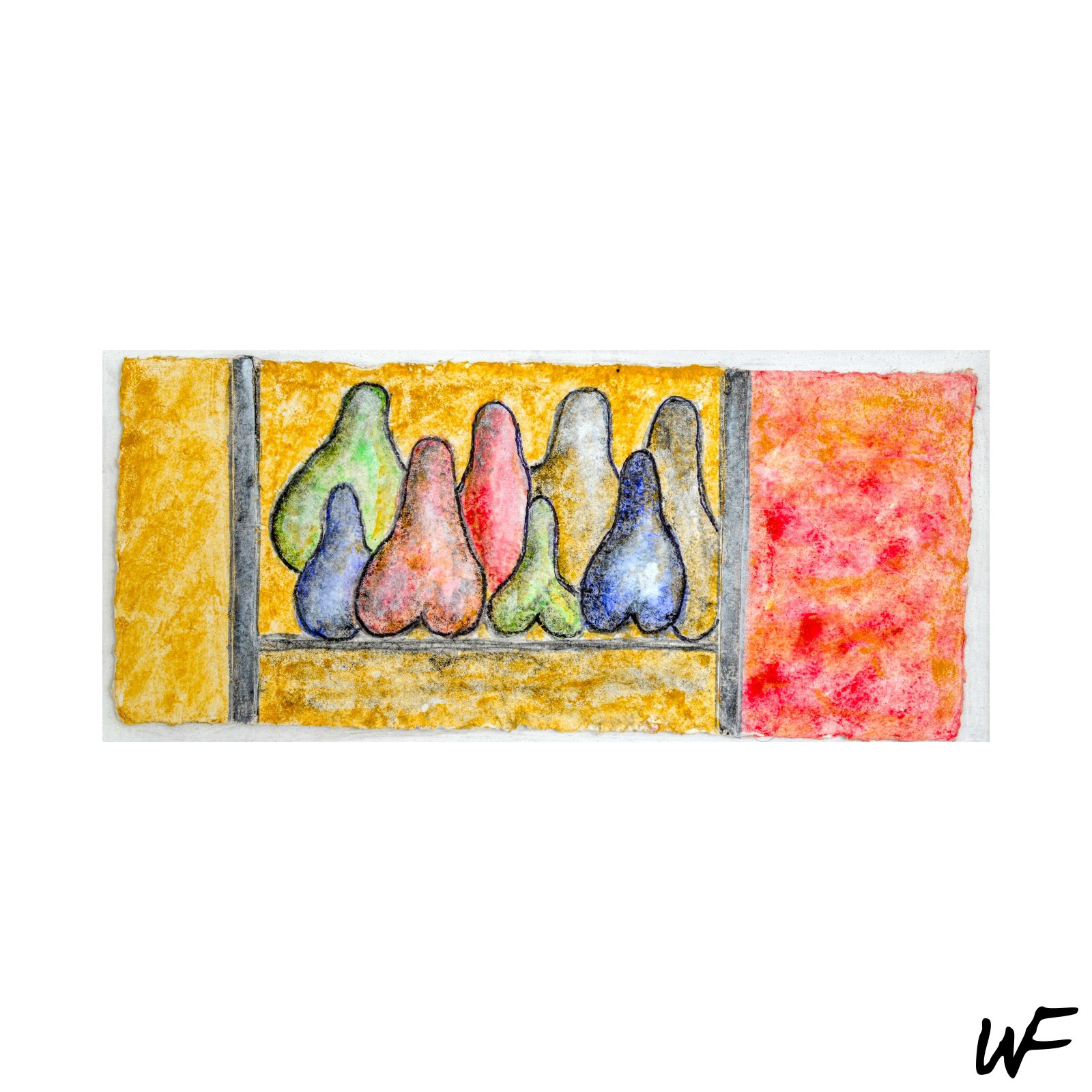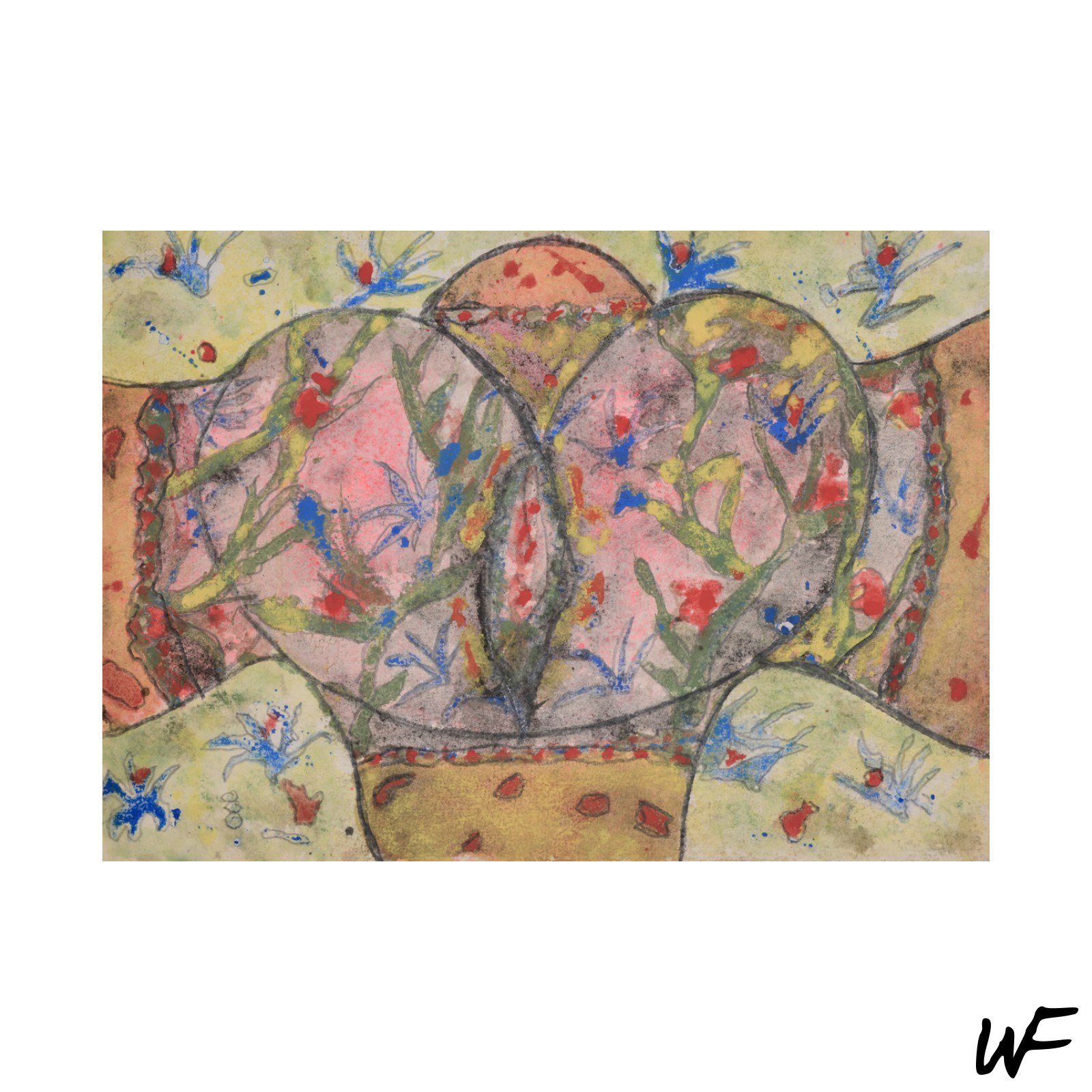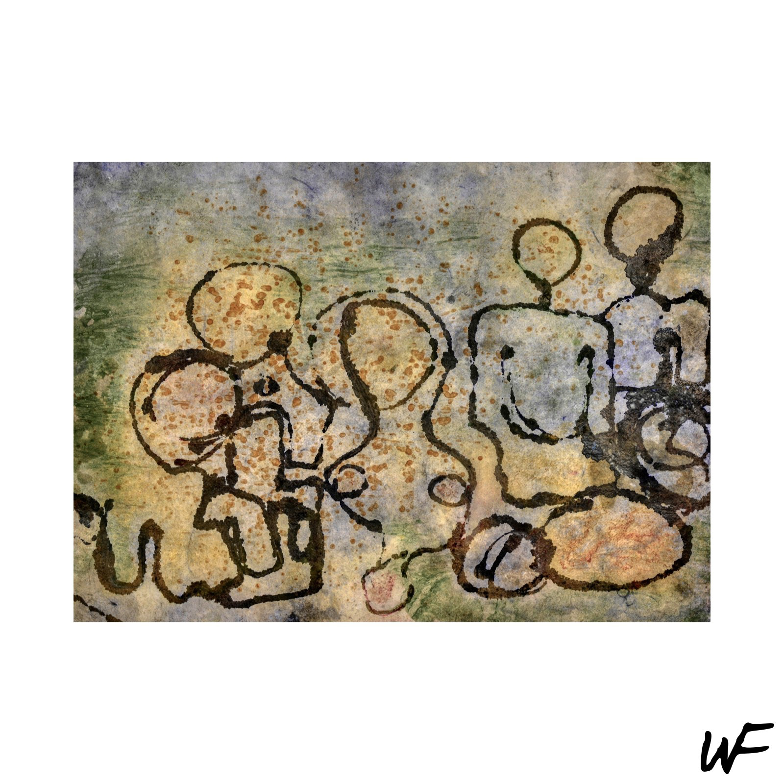 DE / Ein Zyklus subtiler und vielschichtiger Kompositionen, die zwischen Zeichen, Form und Geste balancieren. Der Künstler arbeitet mit einer zarten Pastellpalette, die durch markante Konturen und organische Farbflecken durchbrochen wird. Die Figuren auf den Bildern scheinen zwischen Abstraktion und Erzählung zu schweben – sie erinnern an Symbole urzeitlicher Rituale oder an Fragmente einer visuellen Sprache, die erst im Entstehen begriffen ist.